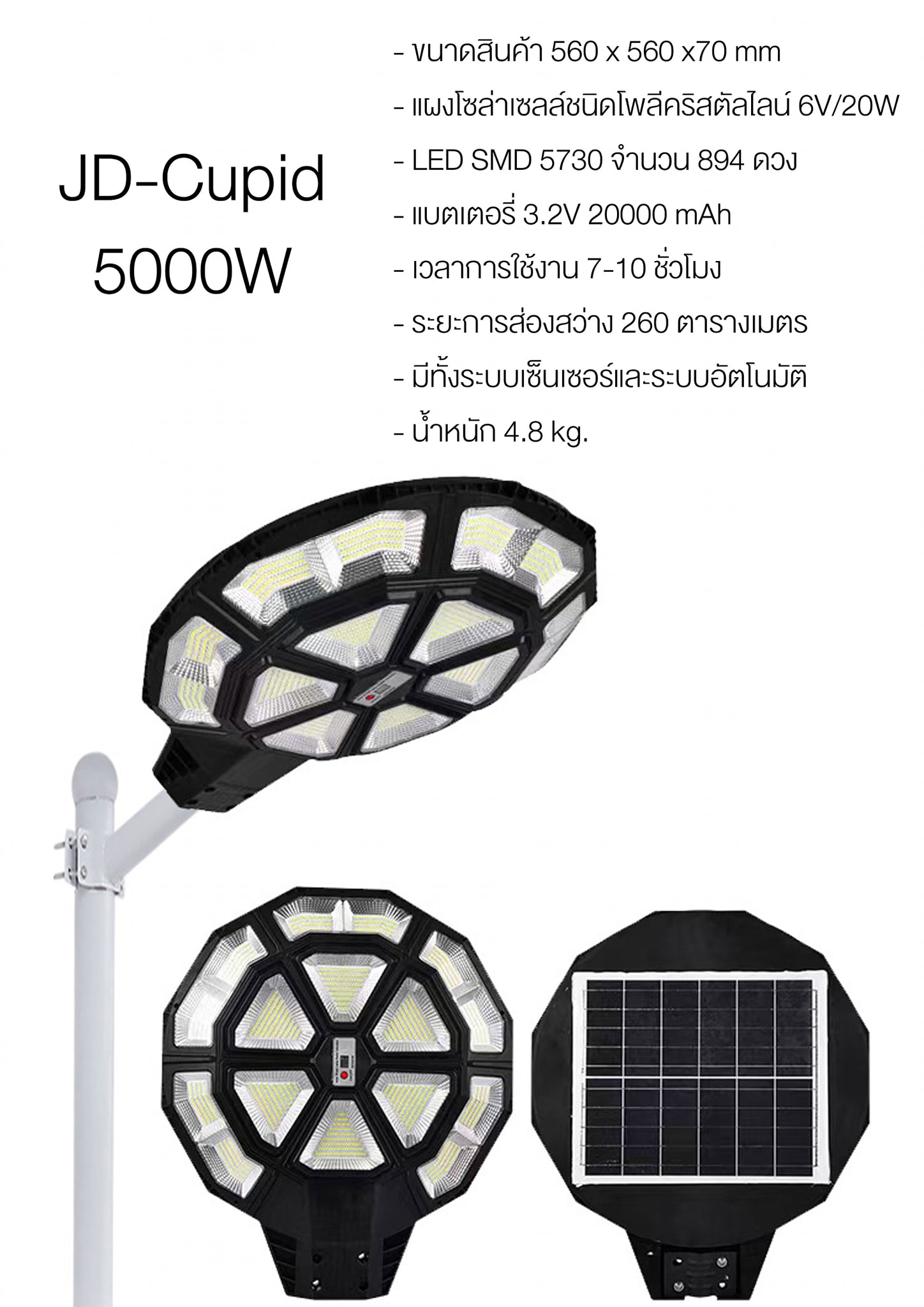 สินค้าใหม่ JD-Cupid 5000W โคมไฟถนนโซล่าเซลล์ พร้อมระบบเซ็นเซอร์อัตโนมัติ ใช้พลังงานแสงอาทิตย์100%