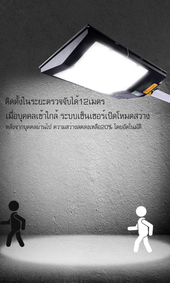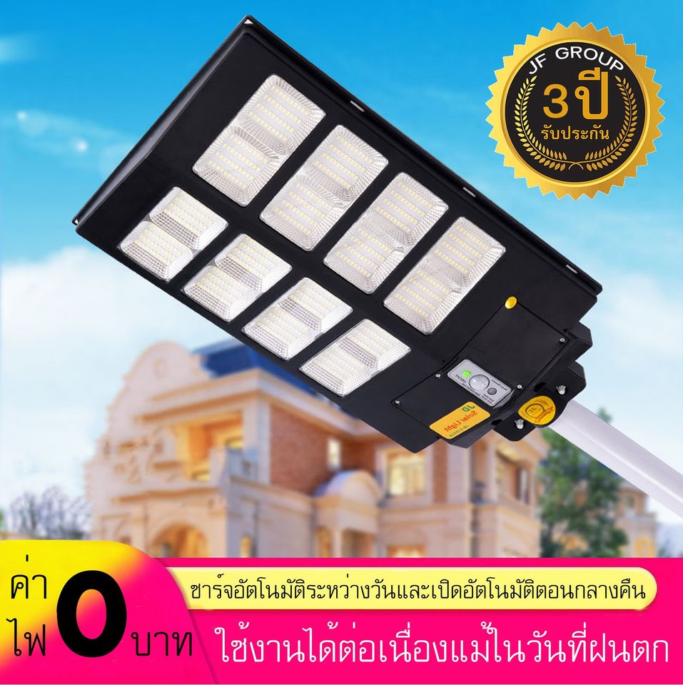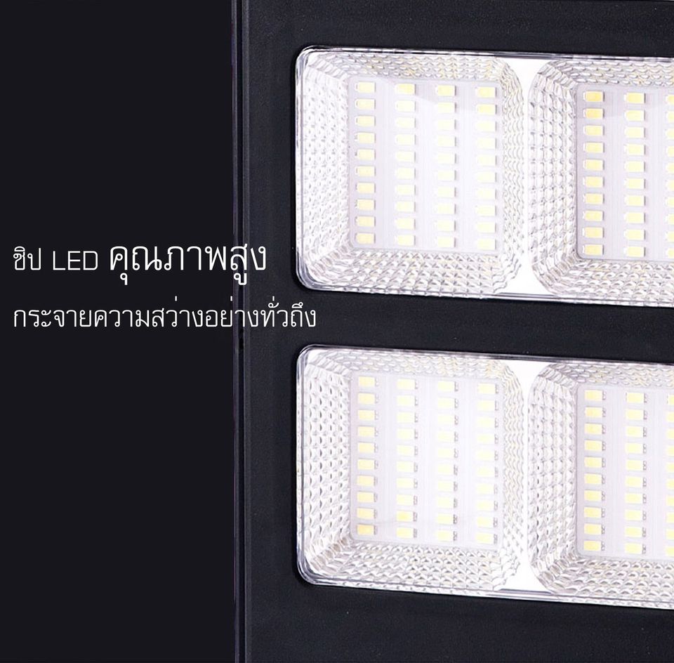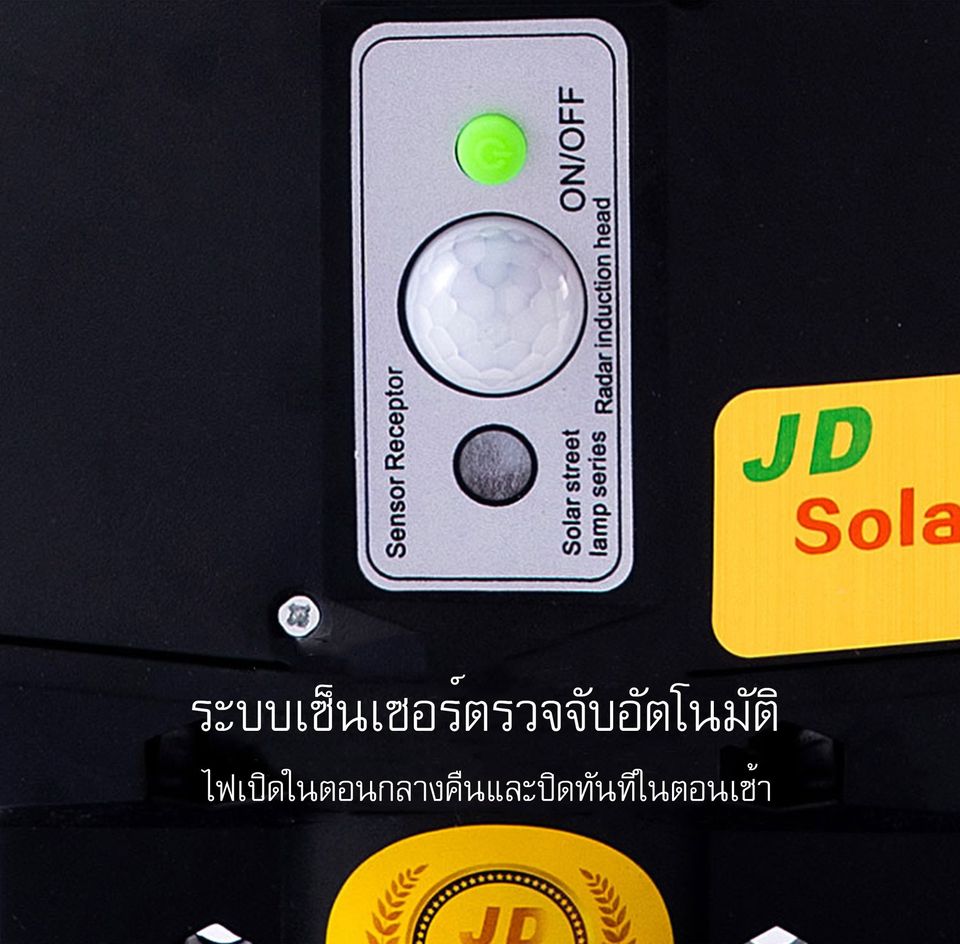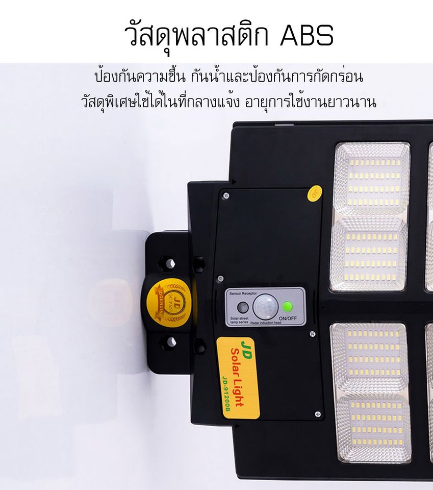 Solar Street Light JD-91600B 1600W - ขนาดสินค้า 597x345x70 mm - ระยะความส่องสว่าง 200x220 ตร.ม - ระบบ Sensor ตรวจจับความเคลื่อนไหว - LED 5630 จำนวน 640 ดวง - มาตรฐานระดับ IP67 กันฝน - Bettery : Lithium Iron 20000 mAh - Solar panel : polycrystalline - การใช้งาน 8-10 ชม. - รับประกันจากศูนย์ไทย 3 ปี