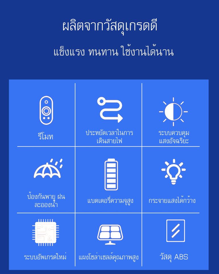 1.โคมไฟ : การออกแบบรูปทรงที่มีความโดนเด่นและทันสมัยใหม่2.LED : รุ่นใหม่ SMD 5730 สว่างมากกว่ารุ่นทั่วไป 3-4 เท่า3.กรอบสะท้อนแสง : การออกแบบเป็นรูปทรงเกล็ดปลาช่วยให้ระบายความร้อนพร้อมทั้งสามารถกระจายแสงกว้างและชัดเจนมากขึ้น4.กระจกครอบโคม : กระจกนิรภัยคุณภาพสูง หนาพิเศษ ทนความร้อน และ ป้องกันน้ำได้ดี5.ฝาครอบหลัง : ผลิตขึ้นรูปจาก ไฟเบอร์ ABS คุณภาพสูงมีความทนทาน น้ำหนักเบาระบายความร้อนได้ดี6.แผงโซล่าเซลล์ : ชนิด polycrystalline คุณภาพเกรด A สามารถผลิตพลังงานชาร์จไฟได้แม้ในที่แสงน้อยหรือในวันที่ฝนตก1.สินค้าแท้ 100% รับประกันศูนย์ไทย 1 ปี2.รับประกันเปลี่ยนสินค้าใหม่ ภายใน 7 วัน(หากสินค้าได้รับการเสียหายหรือชำรุดสามารถแจ้งเพื่อเปลี่ยนสินค้าใหม่ได้ ภายใน 7 วัน นับจากวันที่ลูกค้าได้รับสินค้า)โคมไฟโซล่าเซลล์ solar light ไฟโซล่าเซลล์ ไฟ LED ประหยัดพลังงาน แสงสีขาว โคมไฟพลังงานแสงอาทิตย์ เหมาะกับการใช้งานทุกพื้นที่ โคมไฟภายนอกอาคาร ไฟสนามโซล่าเซลล์ ไฟแต่งสวน ไฟถนน ไฟประดับ ไฟ โซล่าเซลล์ Others ไฟสปอร์ตไลท์ ไฟโซล่าเซลล์ ไฟโซล่าเซลล์ solar solar cell โคมไฟโซล่าเซลล์![]() ![]() ![]() ![]() ![]() ![]() ![]() ![]() ![]() ![]() ![]() ![]() ![]() ![]() ![]() ![]() ![]() ![]() ![]() ![]() ![]() ![]() ![]() |