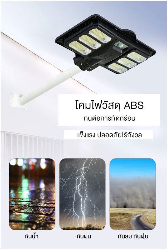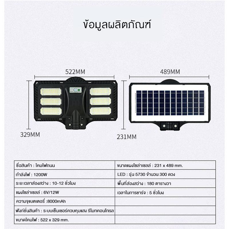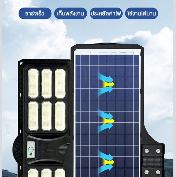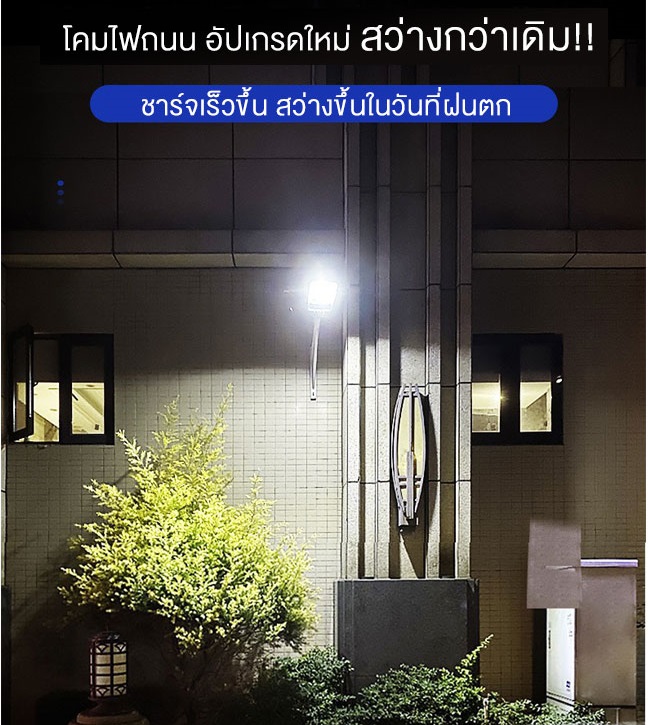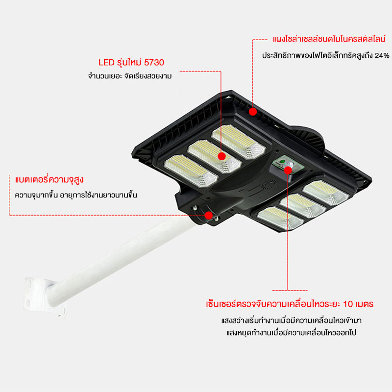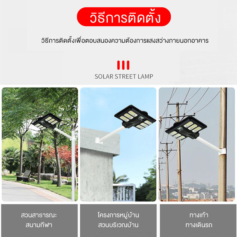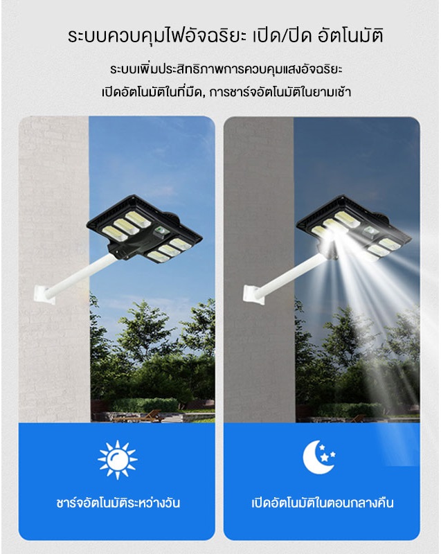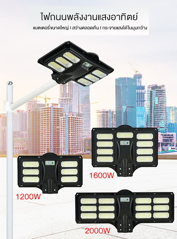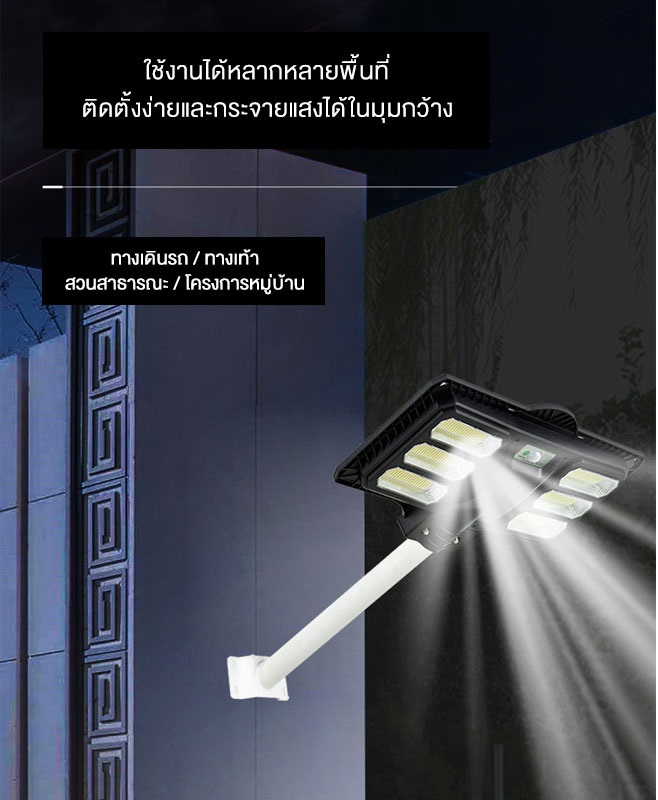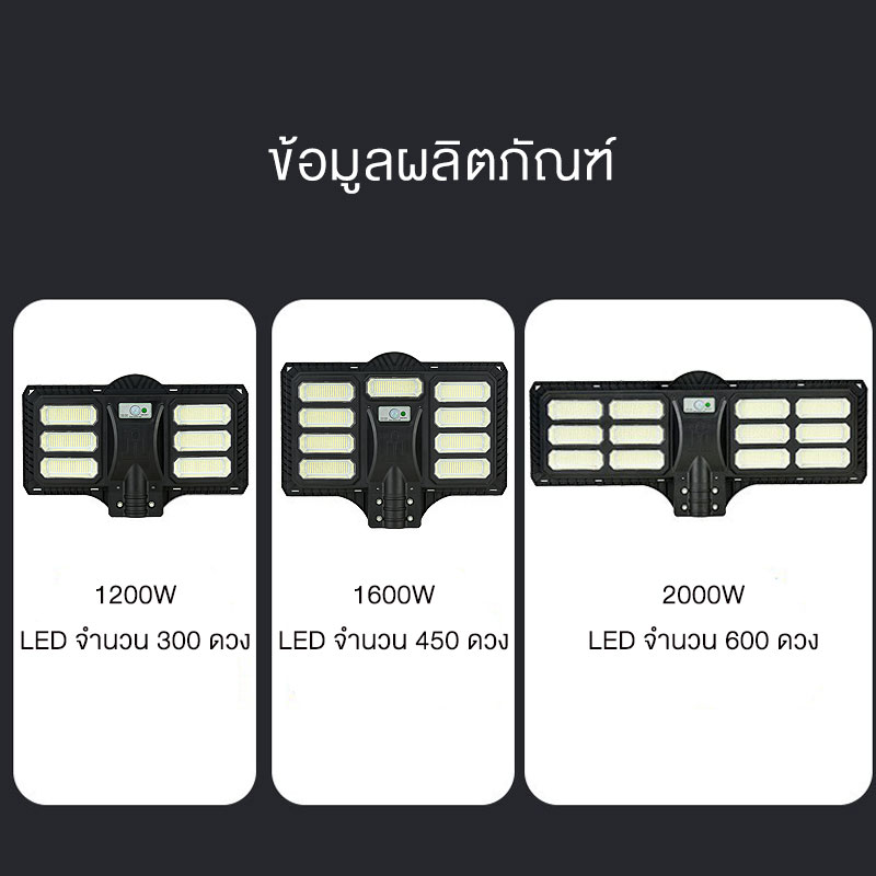 ไฟถนนพลังงานแสงอาทิตย์ โคมไฟโซล่าเซล โคมไฟถนน โคมไฟติดผนัง โคมไฟสปอร์ตไลท์ Solar Light ไฟสปอตไลท์ ควบคุมแสงอัจฉริยะ ไฟถนน LED ไฟสวนกลาง เหมาะสำหรับการติดตั้งภายนอก เช่น อาคารหรือมุมสูงต่างๆ, ลานจอดรถ, สนามกีฬา, ไฟสนาม, ไฟทางเดิน หรือสถานที่ต่างๆ ที่ต้องการแสงสว่าง เป็นต้น รีโมทสามารถตั้งเวลาทำงานอัตโนมัติได้ 2 ชั่วโมง, 3 ชั่วโมง, 4 ชั่วโมง เลือกโหมดปรับแสงสว่างได้ กันแดด กันน้ำ กันฝน ได้ระดับ IP67