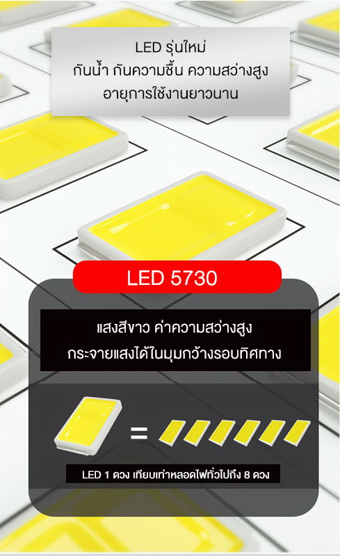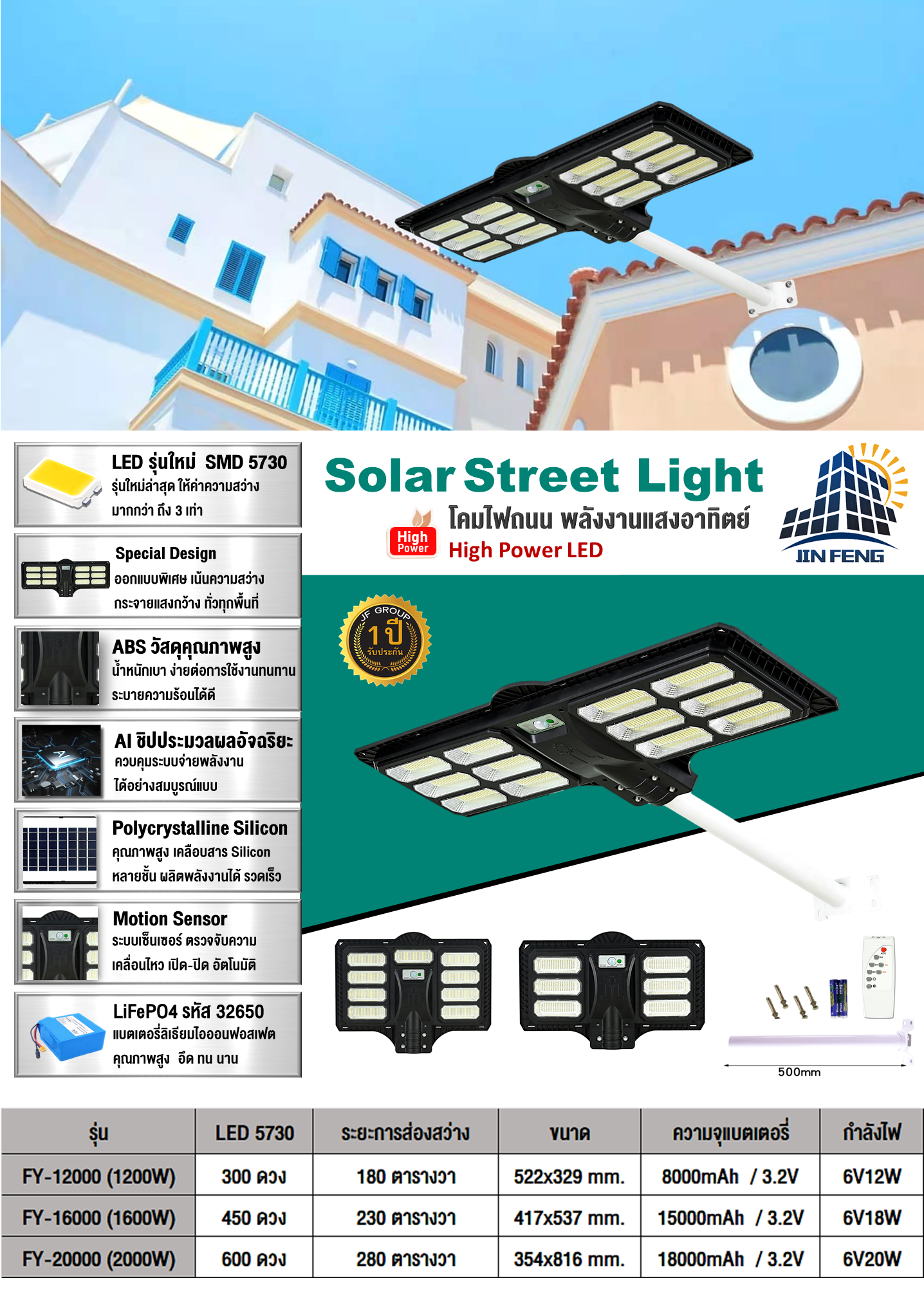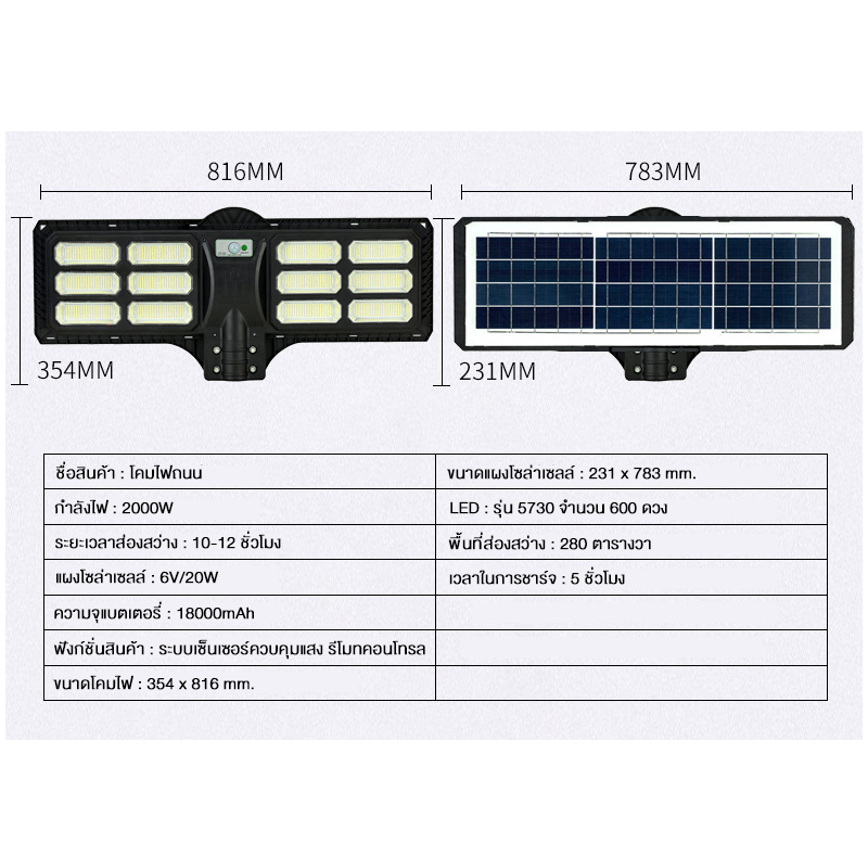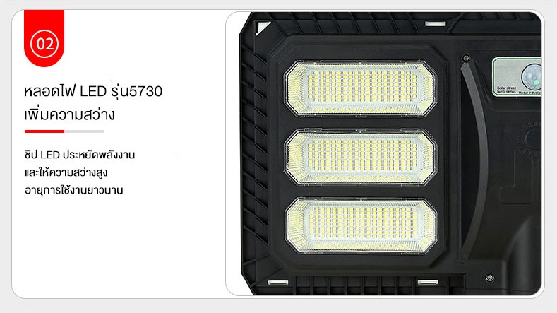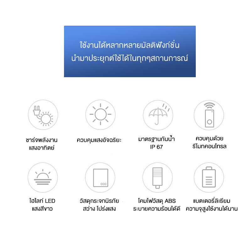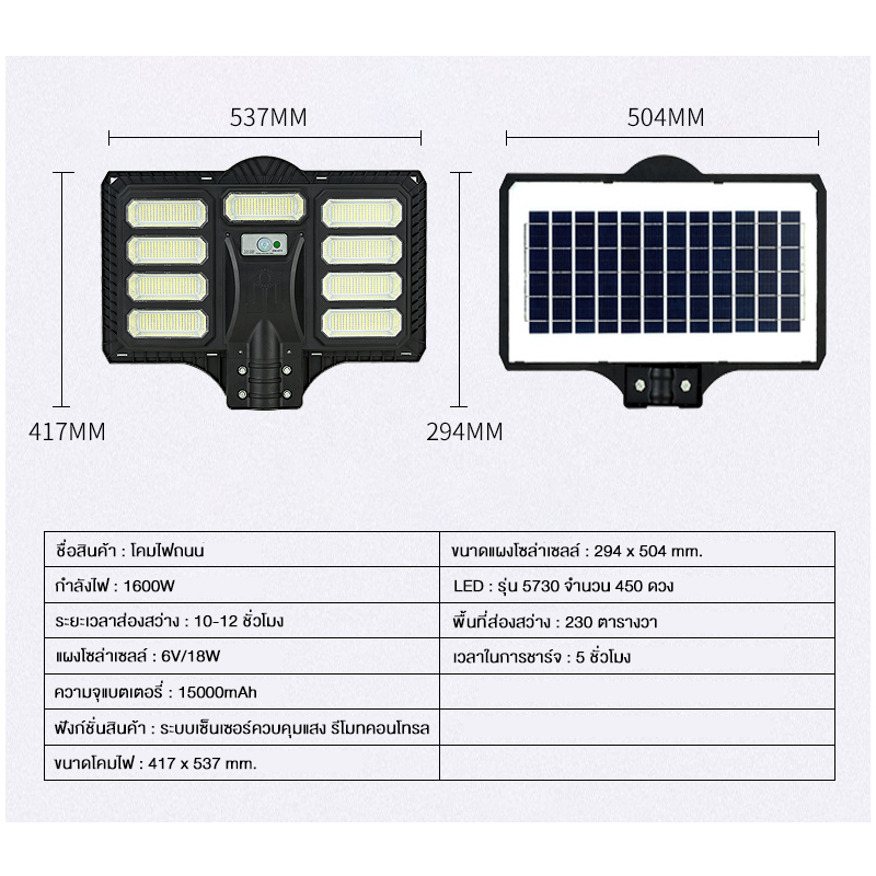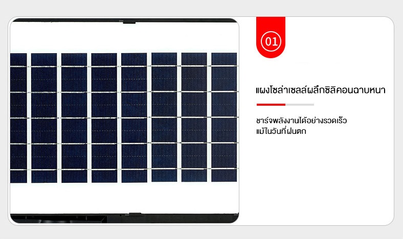- มาตรฐานระดับ IP67 กันแดด กันฝน ทนทาน - Solar Panel : Polycrystalline - โคมไฟอะคริลิคคุณภาพสูง กระจายแสงได้อย่างดี - การใช้งาน 10-12 ชั่วโมง - มาตรฐาน CE, RoHS - รับประกันสินค้า 1 ปี