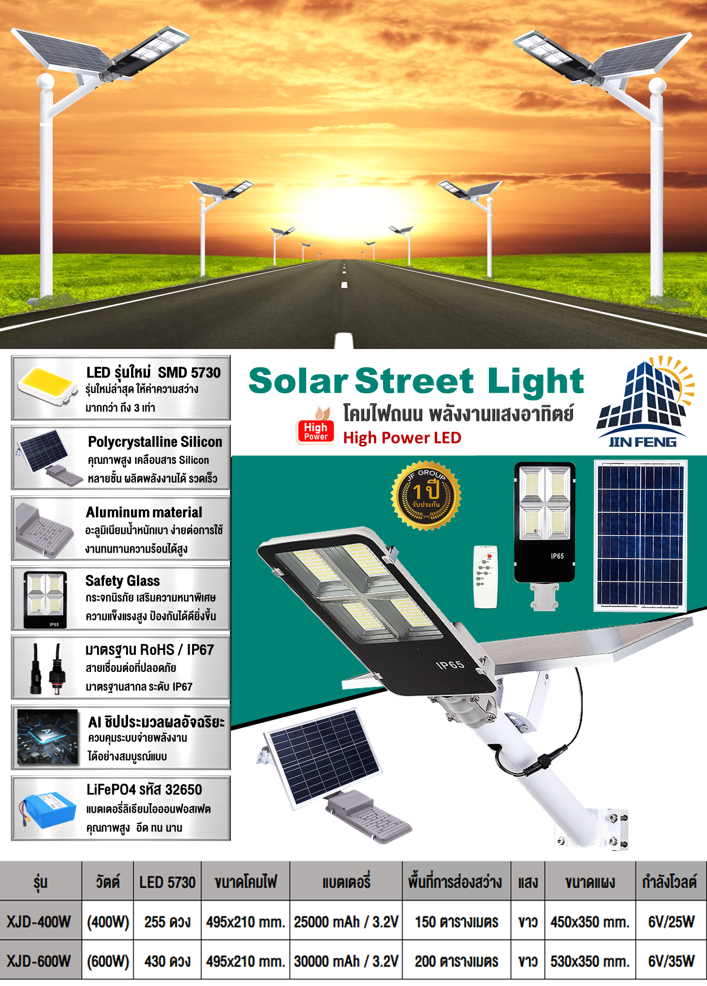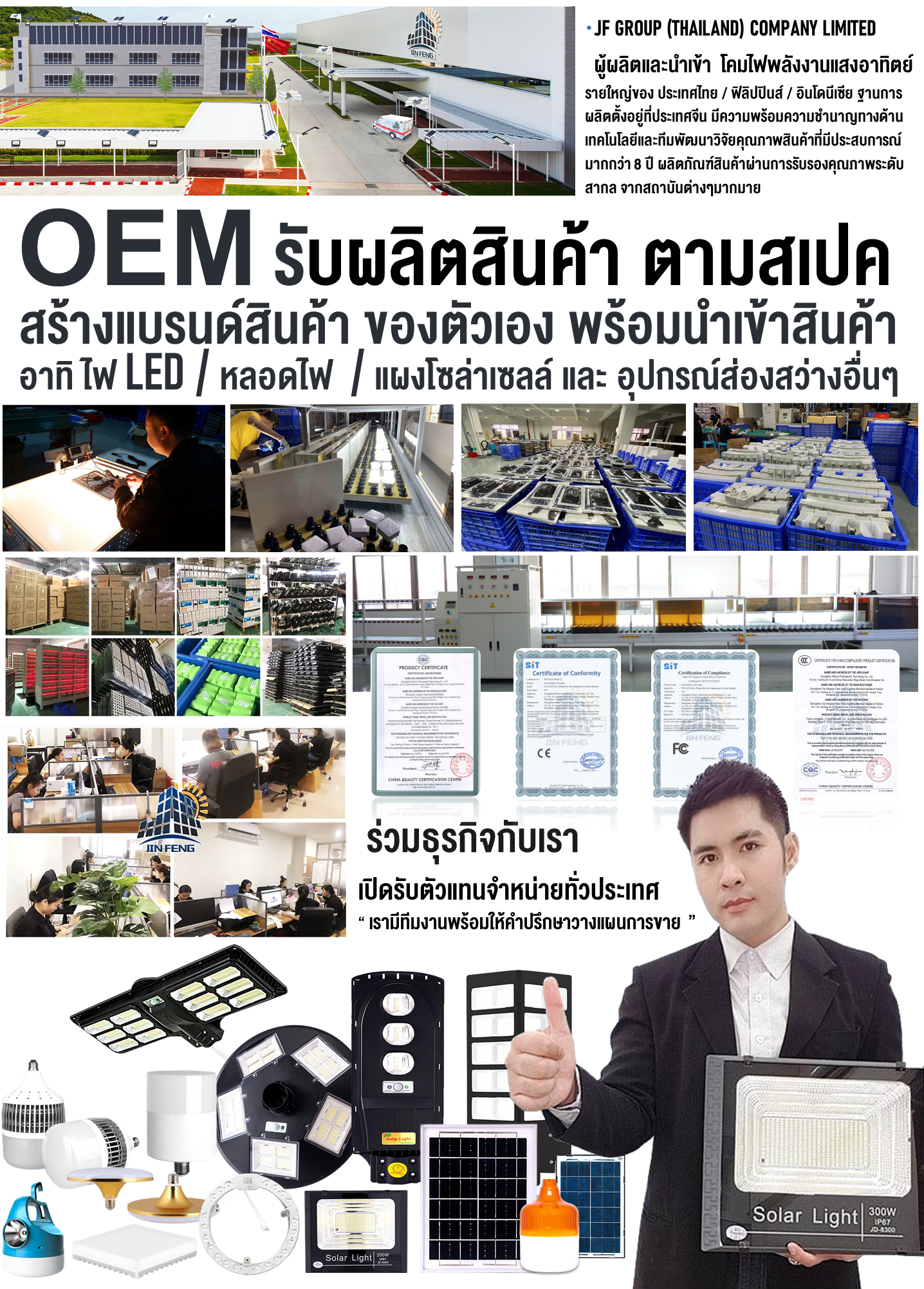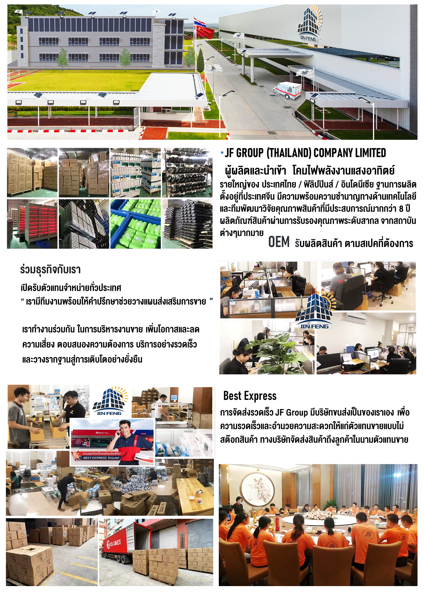 บริษัท JF GROUP (THAILAND) COMPANY LIMITED ผู้ผลิตและนำเข้า โคมไฟสปอร์ตไลท์ พลังงานแสงอาทิตย์ แบรนด์ JINFENG และ JD SOLAR LIGHT แท้100% ประกาศเคลื่อนทัพ เพิ่มการผลิตและนำเข้ามากขึ้น 80% เพื่อรองรับความต้องการของลูกค้า JF GROUP มีฐานการผลิตตั้งอยู่ที่ประเทศจีน มีความพร้อมความชำนาญทางด้านเทคโนโลยีและทีมพัฒนาวิจัยคุณภาพสินค้าที่มีประสบการณ์ ทางด้านพลังงานทดแทน มากกว่า 8 ปี ผลิตภัณฑ์สินค้าผ่านการรับรองคุณภาพจากสถาบันต่างๆมากมาย