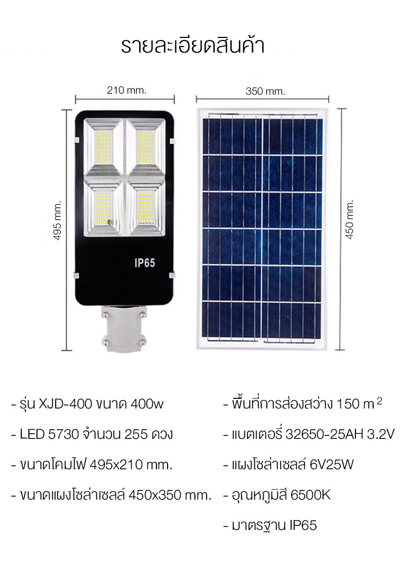 - ประเภท LED5730 : 255 ดวง ความสว่างสูง - ขนาดโคมไฟ 495 x 210 mm. - ขนาดแผงโซล่าเซลล์ 450 x 350 mm. 6V25W - วัสดุโคมไฟอะลูมิเนียมแข็งแรง ทนต่ออุณหภูมิสูง ระบายความร้อนได้ดี ป้องกันสนิม ป้องกันการกัดกร่อน - แบตเตอรี่ลิเธียมฟอสเฟตรุ่น 32650 ขนาด 25000mAh /3.2V กระแสไฟคงที่ - สายเชื่อมต่อเสถียรป้องกันไฟฟ้าช็อต - วัสดุกระจกนิรภัยความแข็งแรงสูงป้องกันการแตกร้าวได้ดี - อุณหภูมิสี 6500k - มาตรฐาน IP65 ประสิทธิภาพการกันน้ำกันฝุ่นที่ยอดเยี่ยม - พื้นที่การส่องสว่าง150 ตารางเมตร
