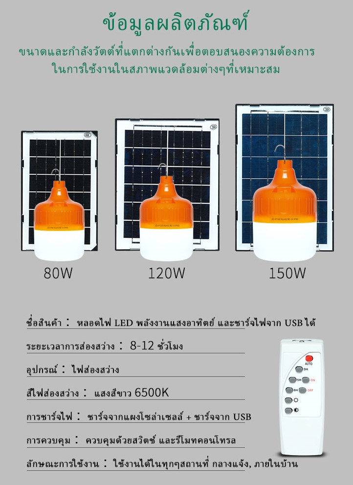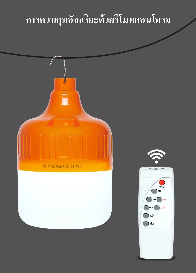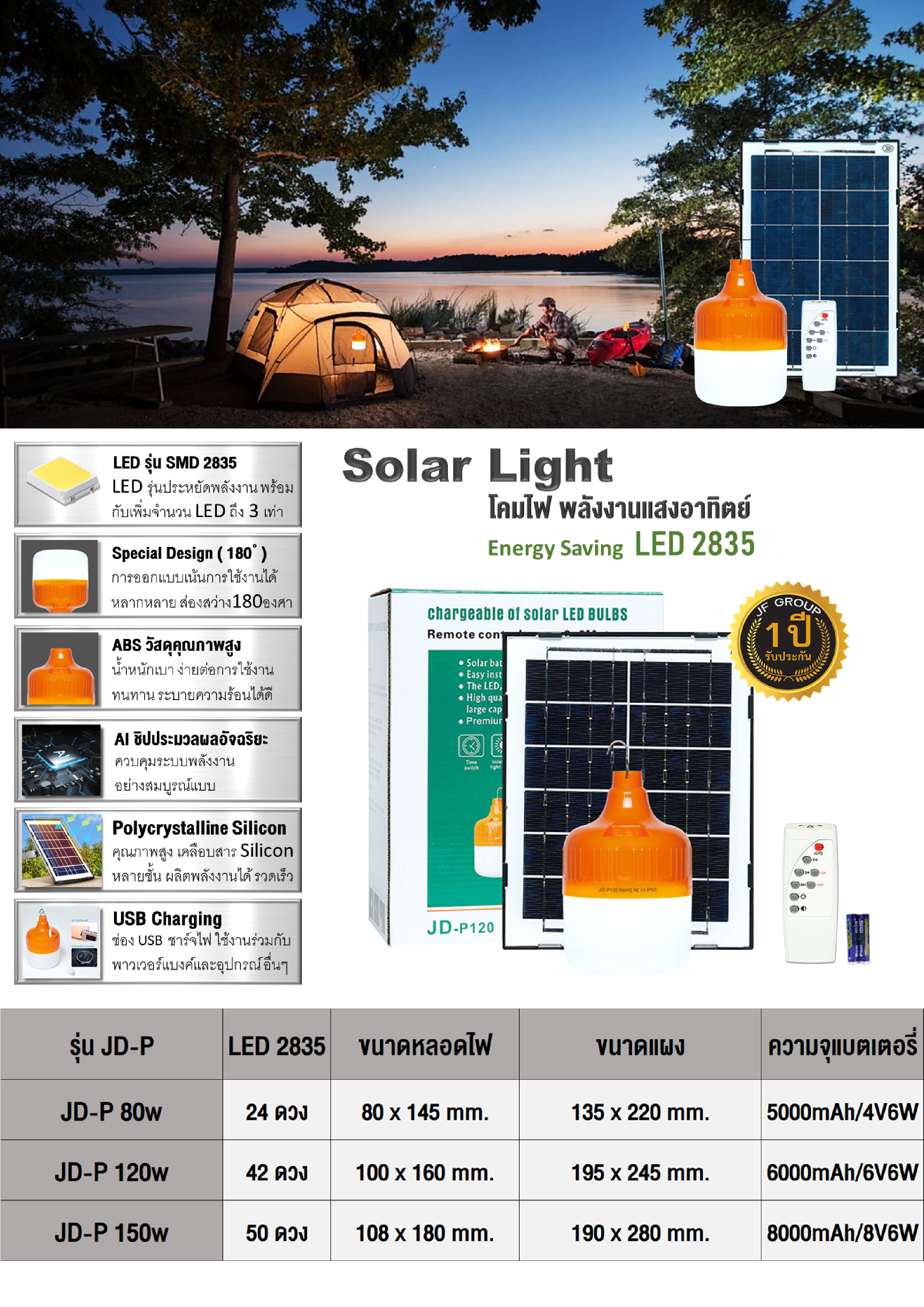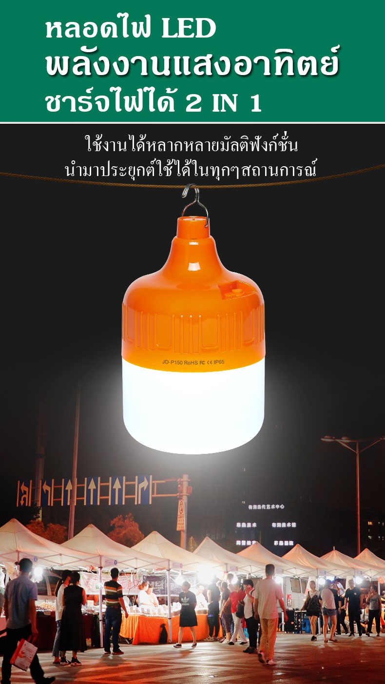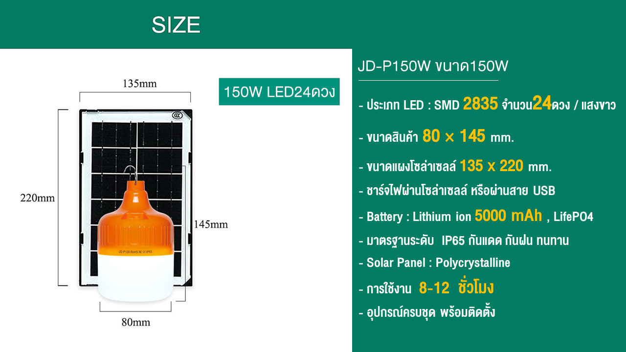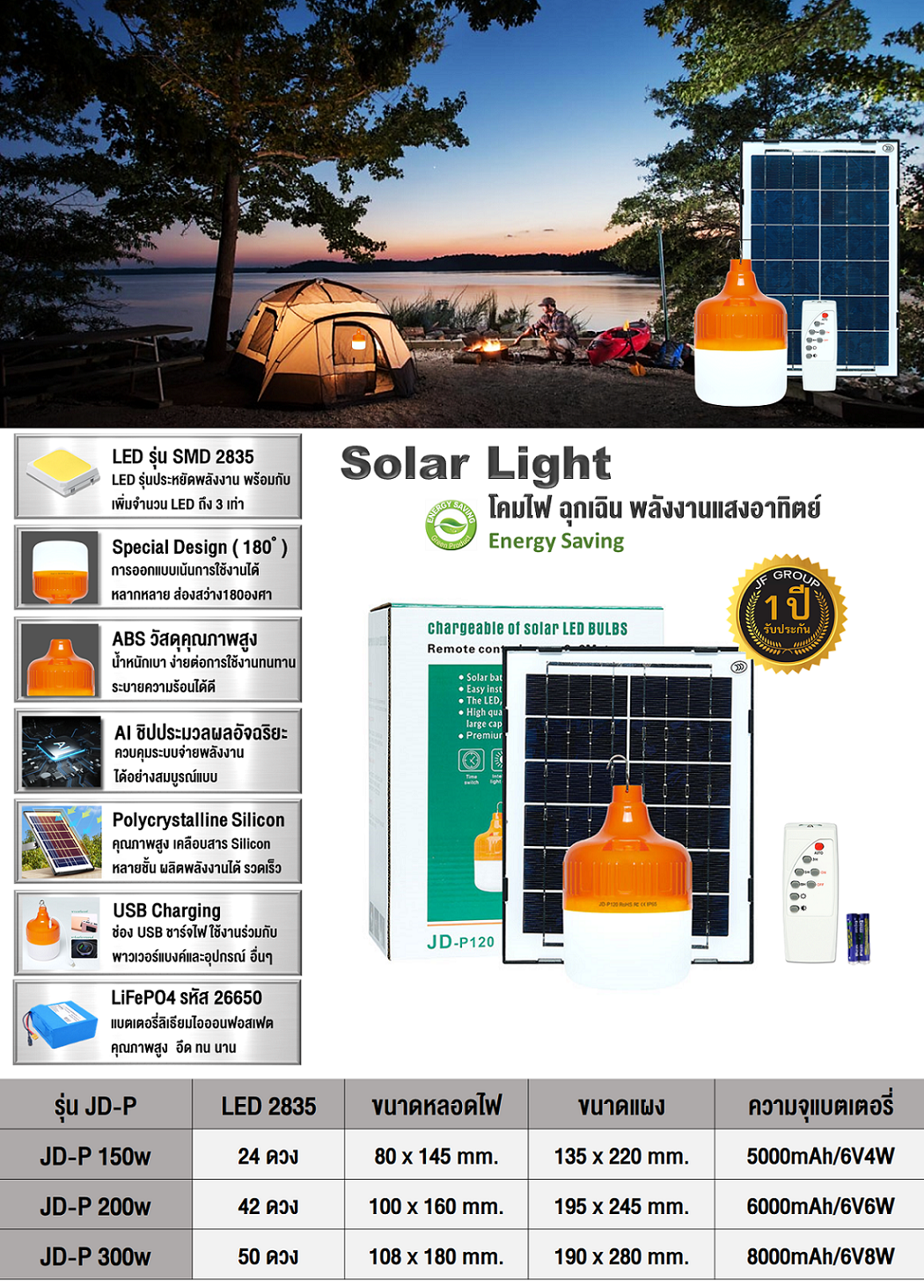 ไฟตุ้มโซล่าเซลล์ Solar light ไฟLED ส่งฟรี ไฟโซล่าเซลล์ โซล่าเซลล์ Solar Cell แสงสีขาว พร้อมรีโมท ไฟภายนอกอาคาร ไฟแคมป์ปิ้ง ไนท์มาร์เก็ต ตกปลา ไฟฉุกเฉิน รับประกัน 1 ปี คุณภาพของสินค้าJD-P150 ขนาด 150 วัตต์ - ขนาดหลอดไฟ 80 x 145 mm. - ขนาดแผงโซล่าเซลล์ 135 x 220 mm. ความจุแผง 6V/4W - แบตเตอรี่ 5000 mAh ของแท้ - มีแบตเตอรี่ในตัว 32650 - SMD LED 2835 จำนวน 24 ดวง - ใช้งานง่ายสามารถแยกหลอดไฟออกมาใช้ได้ หรือต่อกับแผงโซล่าเซลล์ มีไว้สำหรับชาร์จรถยนต์ - ชาร์จไฟผ่านโซล่าเซลล์ หรือผ่านสาย USB - แสงไฟสีขาว 6500k - มุมกระจายแสงไฟ 180° - IP 65 สามารถกันละอองฝุ่น / ละอองน้ำได้ สำหรับใช้งานติดตั้งภายในและภายนอกในบริเวณที่ไม่โดนน้ำหรือความชื้น - สายไฟแผงโซล่าเซลล์ยาว 5 เมตร - ใช้งานได้นาน 6 - 8 ชั่วโมง แผงโซล่าเจอความมืดไฟถึงจะติด - เหมาะสำหรับกิจกรรม แคมป์ปิ้ง ท่องเที่ยว ซ่อมรถยนต์หรือเครื่องจักร ไฟฟ้าดับ ไฟทางเดินในบ้าน เรือประมง สถานที่ไม่มีไฟฟ้า และงานระบบโซล่าเซลล์ - รับประกัน 1 ปี