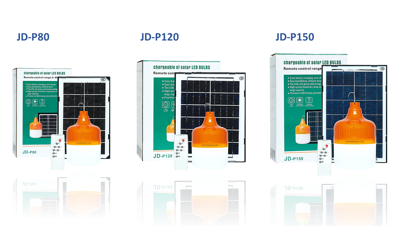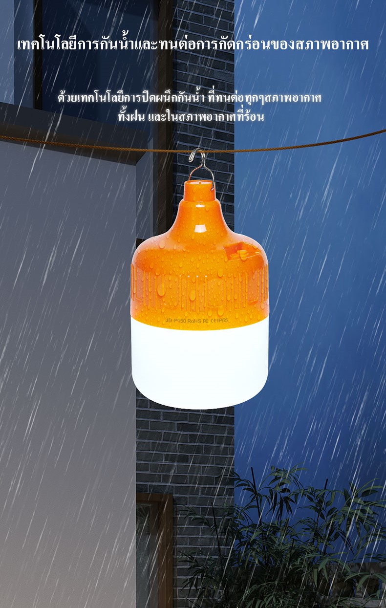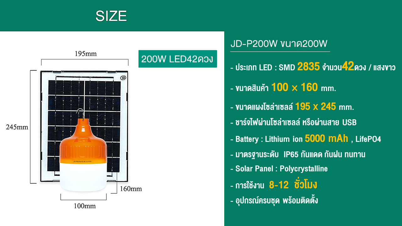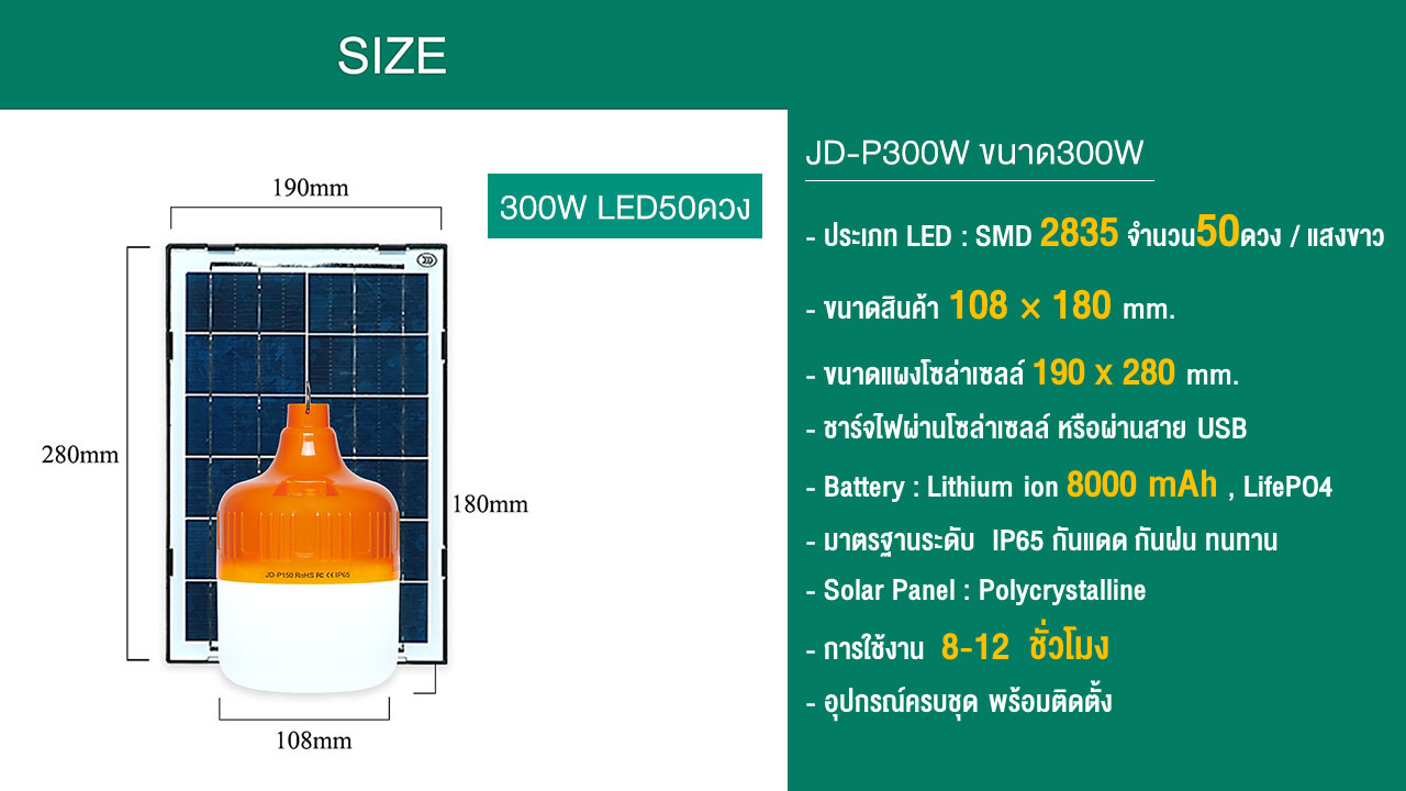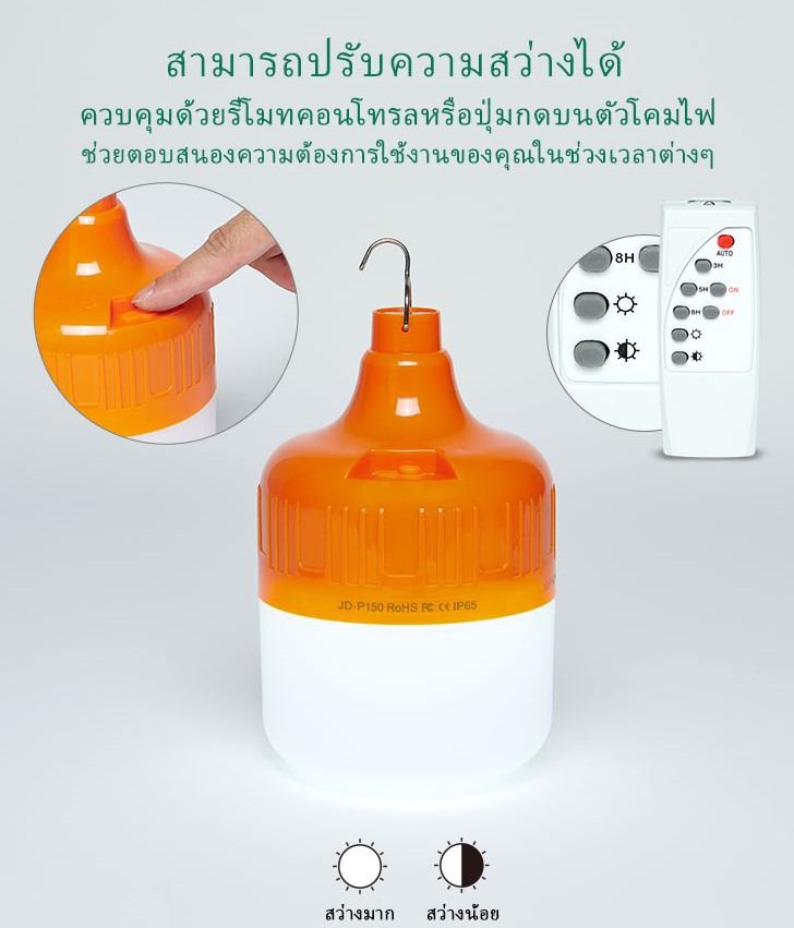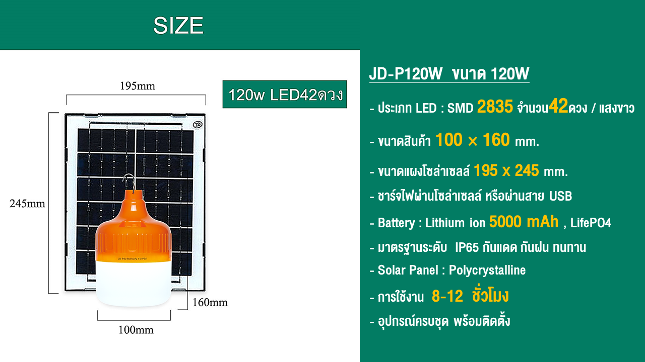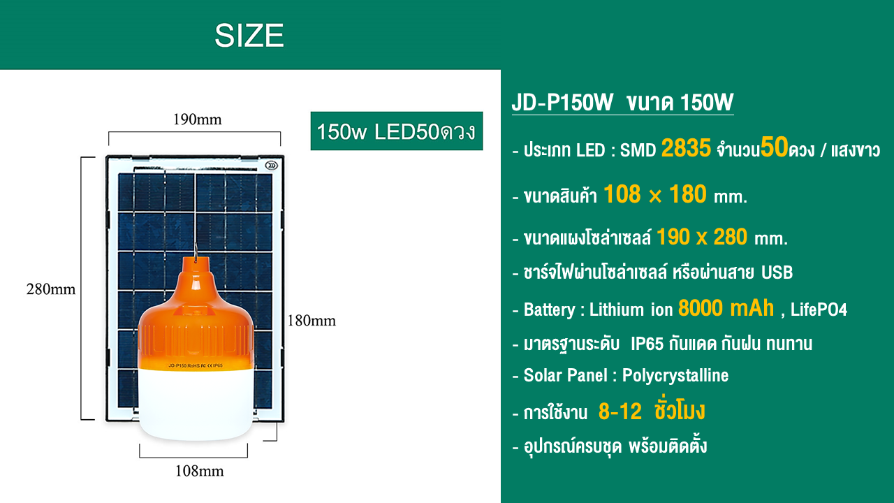 ไฟตุ้มโซล่าเซลล์ Solar light ไฟLED ส่งฟรี ไฟโซล่าเซลล์ โซล่าเซลล์ Solar Cell แสงสีขาว พร้อมรีโมท ไฟภายนอกอาคาร ไฟแคมป์ปิ้ง ไนท์มาร์เก็ต ตกปลา ไฟฉุกเฉิน รับประกัน 1 ปี คุณภาพของสินค้าJD-P150 ขนาด 150 วัตต์ - ขนาดหลอดไฟ 80 x 145 mm. - ขนาดแผงโซล่าเซลล์ 135 x 220 mm. ความจุแผง 6V/4W - แบตเตอรี่ 5000 mAh ของแท้ - มีแบตเตอรี่ในตัว 32650 - SMD LED 2835 จำนวน 24 ดวง - ใช้งานง่ายสามารถแยกหลอดไฟออกมาใช้ได้ หรือต่อกับแผงโซล่าเซลล์ มีไว้สำหรับชาร์จรถยนต์ - ชาร์จไฟผ่านโซล่าเซลล์ หรือผ่านสาย USB - แสงไฟสีขาว 6500k - มุมกระจายแสงไฟ 180° - IP 65 สามารถกันละอองฝุ่น / ละอองน้ำได้ สำหรับใช้งานติดตั้งภายในและภายนอกในบริเวณที่ไม่โดนน้ำหรือความชื้น - สายไฟแผงโซล่าเซลล์ยาว 5 เมตร - ใช้งานได้นาน 6 - 8 ชั่วโมง แผงโซล่าเจอความมืดไฟถึงจะติด - เหมาะสำหรับกิจกรรม แคมป์ปิ้ง ท่องเที่ยว ซ่อมรถยนต์หรือเครื่องจักร ไฟฟ้าดับ ไฟทางเดินในบ้าน เรือประมง สถานที่ไม่มีไฟฟ้า และงานระบบโซล่าเซลล์ - รับประกัน 1 ปี