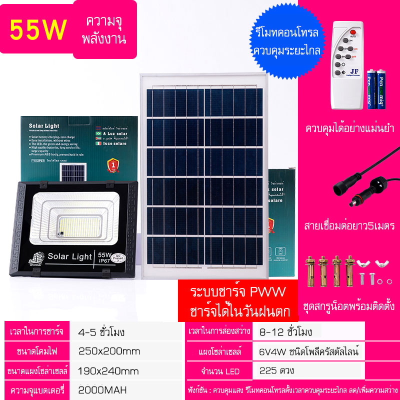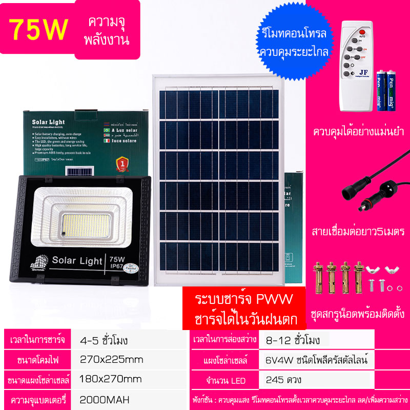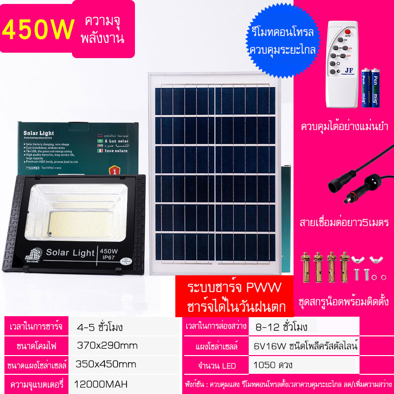 JF ไฟโซล่าเซลล์ 450W 350W 250W 150W 75W 55W ไฟสปอตไลท์ Solar light พร้อมรีโมท แสงสีขาว ไฟสปอร์ตไลท์ ไฟ Solar Cell กันน้ำ IP67 รับประกัน 1 ปี